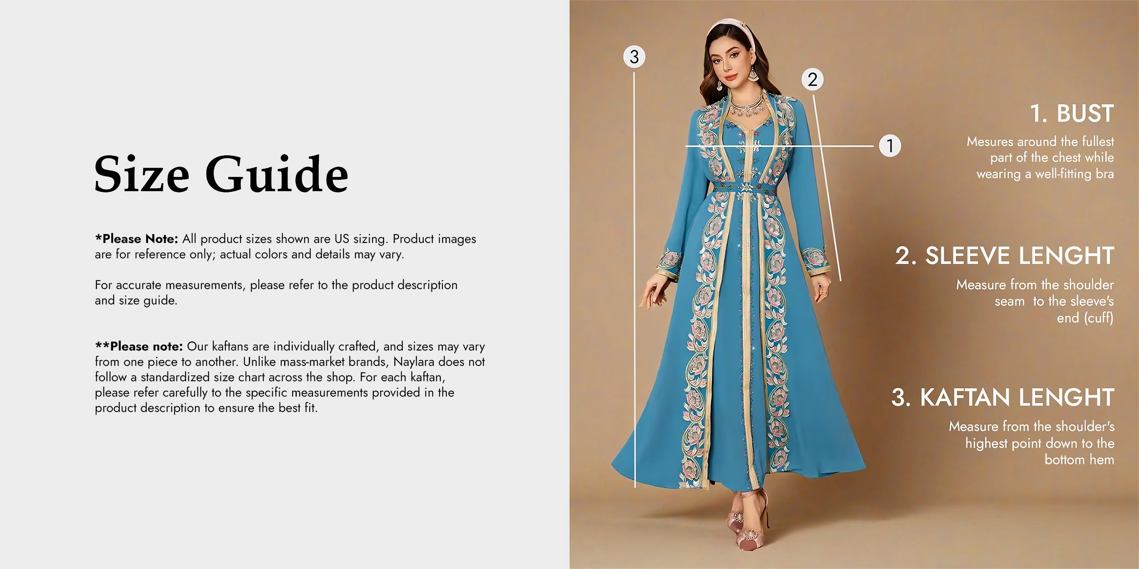 Our size guide is intended as a general reference to help place your measurements in relation to our kaftans. Please note that each piece is individually crafted and may feature unique specifications that do not always align with standardized sizing.