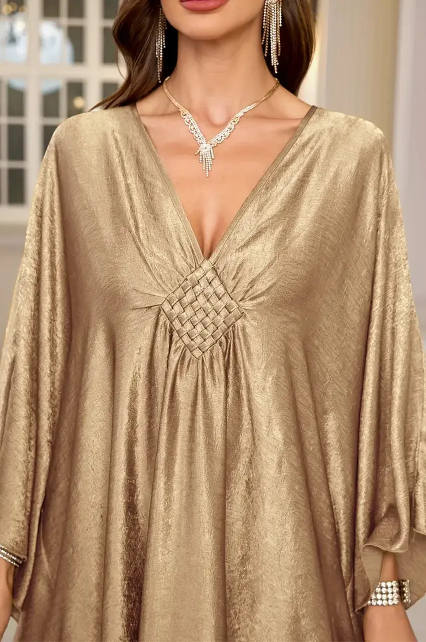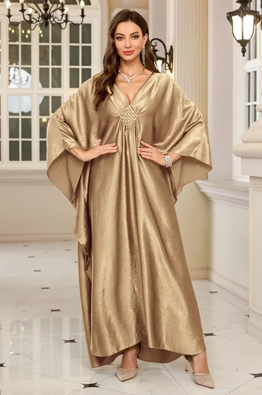 The INARA Gold Batwing Kaftan embodies effortless luxury with its fluid metallic fabric, soft sheen and sculptural batwing sleeves.